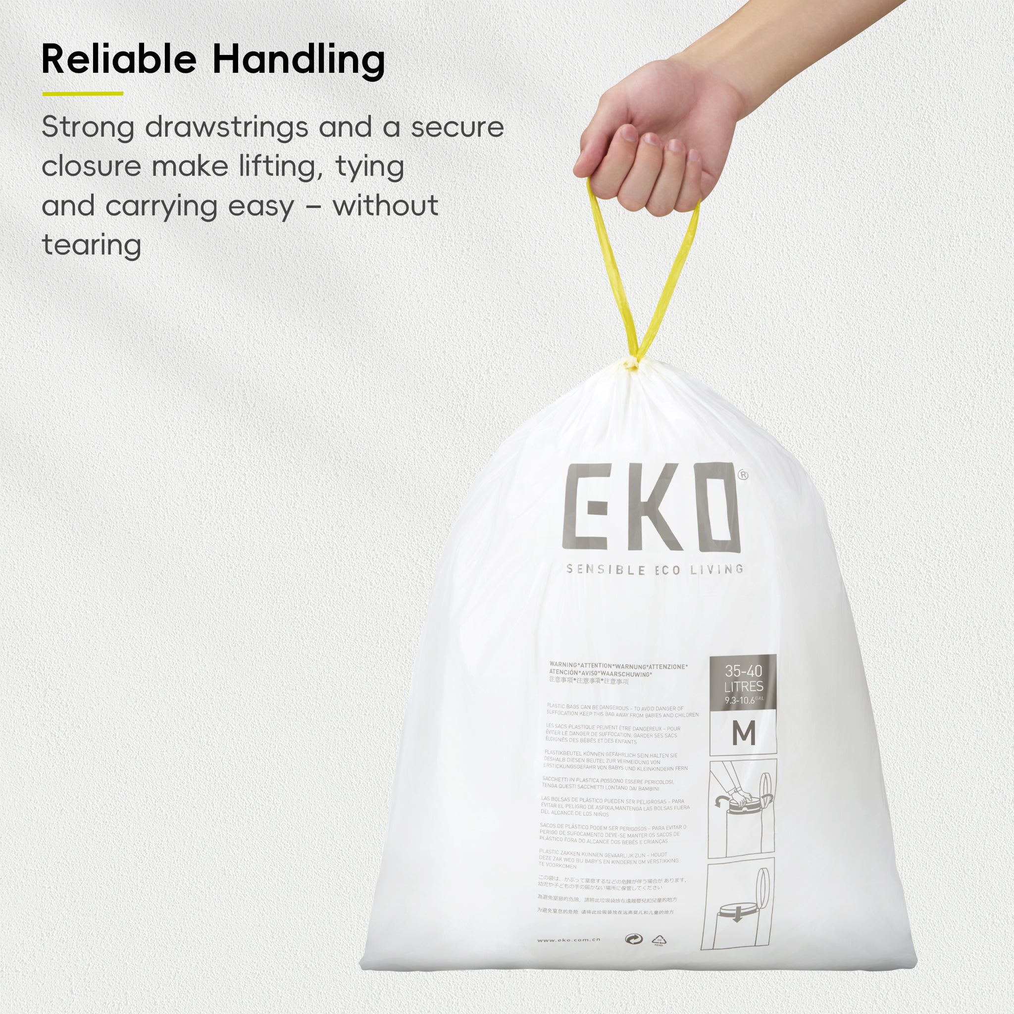 [LIFT, TIE AND CARRY] Reinforced drawstrings turn each liner into a secure drawstring bag, allowing for easy lifting, secure tying and comfortable carrying, helping keep waste disposal clean and hassle-free.
